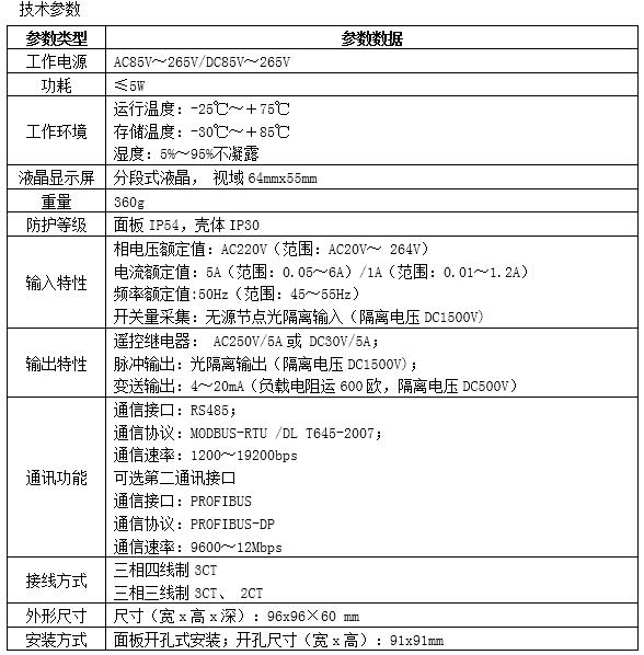 通信协议:MODBUS-RTU、DLT645-2007、PROFIBUS-DP;