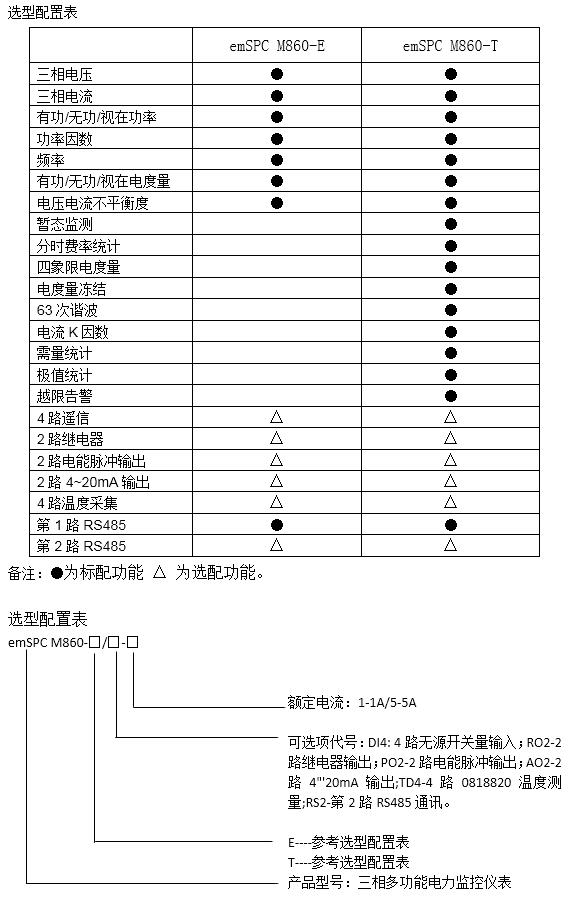 emSPC M860系列三相多功能电力监控仪表主要应用于中低压系统的智能电力监控装置,拥有强大的采集、 处理、 统计和控制功能, 具有三相交流电参量的测量与计算、 电度量累计、2~63次谐波分析、电能脉冲计数、开关量监测、故障记录、继电器输出控制、 直流变送输出、电能脉冲输出、越限告警、温度测量、复费率电度量统计等多种功能。有功测量精度达到0.2级。